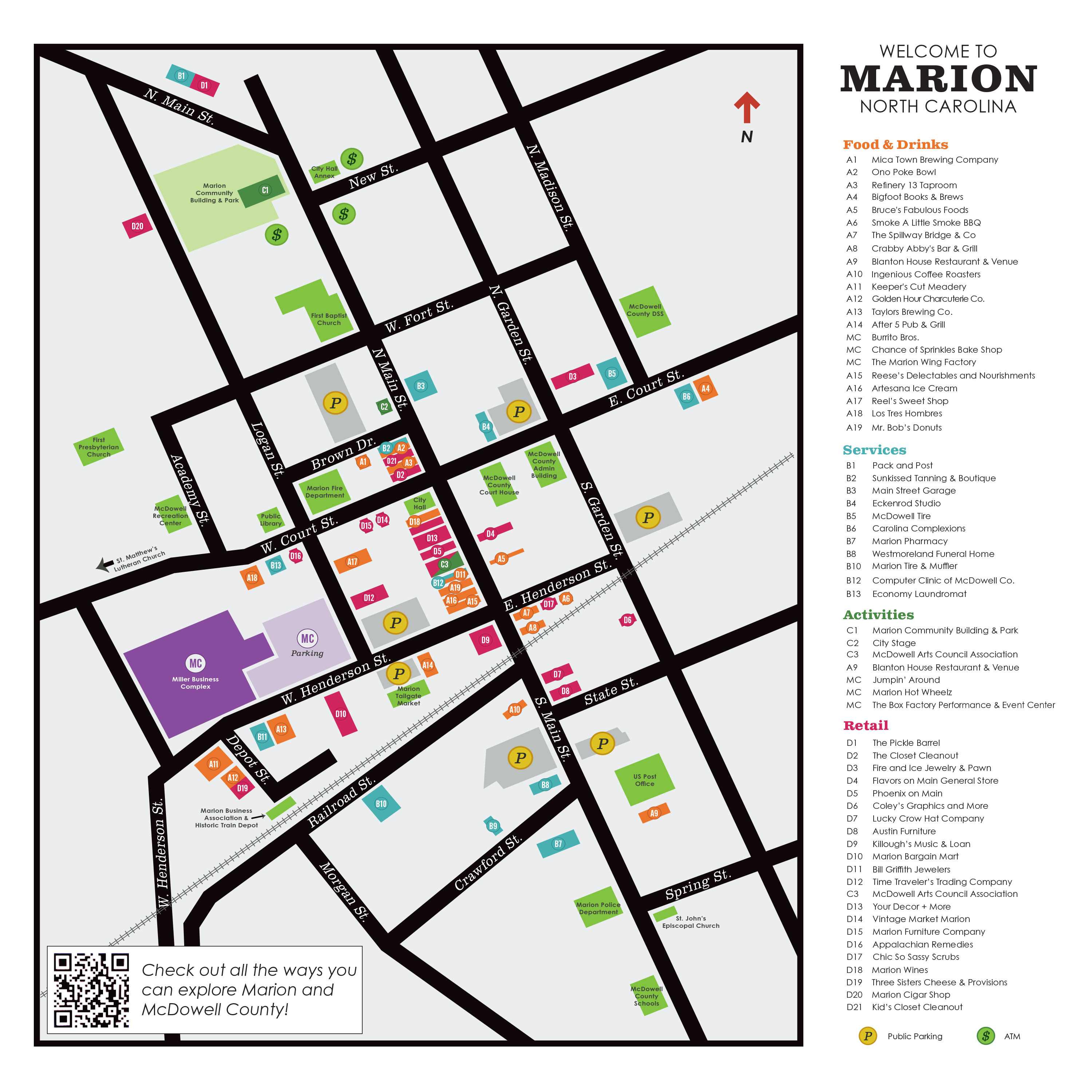 Check out this map to guide your downtown explorations during Mountain Glory Festival! Festival activities take place along Main Street, but you’ll also find plenty of local shops, restaurants, and attractions to enjoy throughout downtown Marion. Use the map to discover food and drink spots, services, retail, and parking locations to make the most of your day.